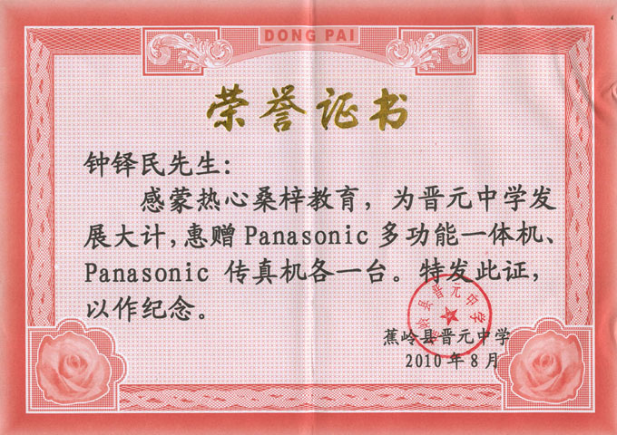 华城锡业钟铎民晋元中学捐赠证书