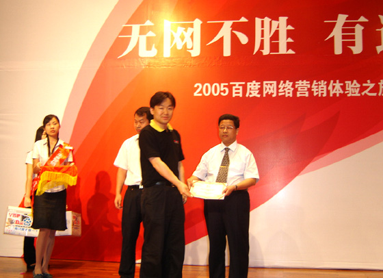 总经理钟铎民在颁奖现场与百度产品市场总监王湛(左)合影